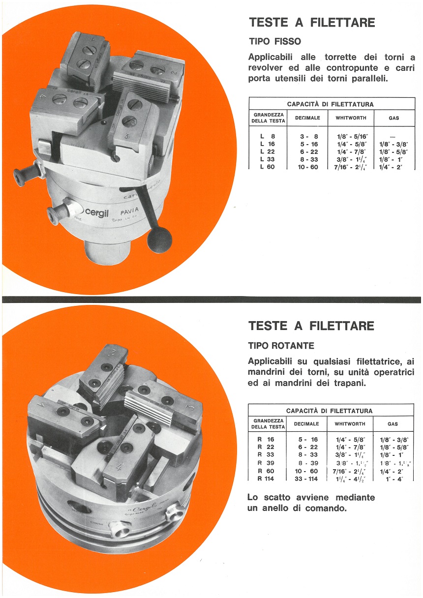 1976: La produzione si evolve. Dalla produzione di teste fisse di filettatura, Cergil si evolve alla produzione di filiere rotanti a scatto automatico, diventando così l’unica realtà europea specializzata nella realizzazione di questo tipo di testa di filettatura.